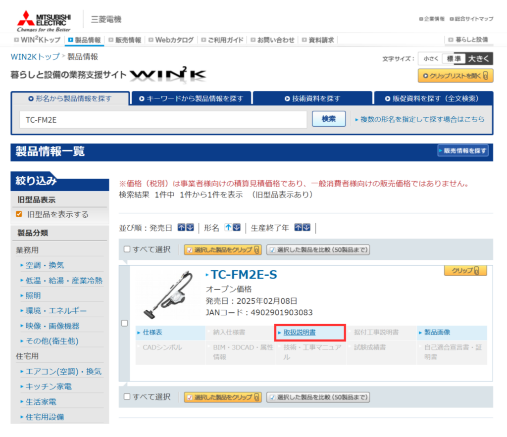 形名を入れて検索を押すと製品情報一覧から商品が表示され、取扱説明書を確認できます。(↓例)